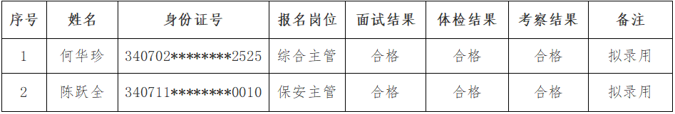 根据《铜陵保祥城市服务有限公司招聘工作人员公告》规定,经过报名、面试、体检、考察等环节,现将拟录用人员公示如下(见附件)。